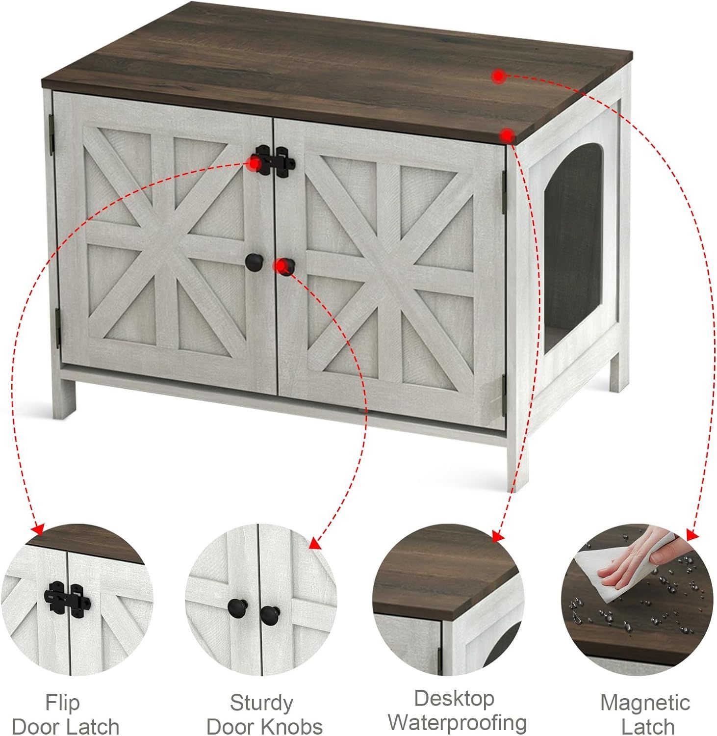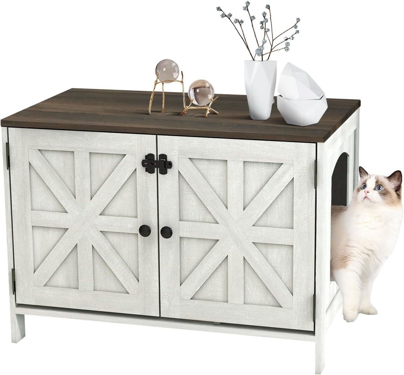 Give your adorable feline friend a private potty space! Our all-in-one modern barn door cat litter cabinet is a practical and beautiful cat litter solution that meets your cat's needs while adding style and comfort to your home. Furniture-style litter box storage not only provides your pet with a perfect private space to hide away that unpleasant litter box, but it can also be the perfect addition to your home decor!Cat litter cabinets with wide side openings are an ideal choice, whether your cat is a large or small breed. Provides convenient entry and exit while effectively controlling the scattering of cat litter. Choose our cat litter cabinet to give you and your cat a tidy and pleasant living environment.
