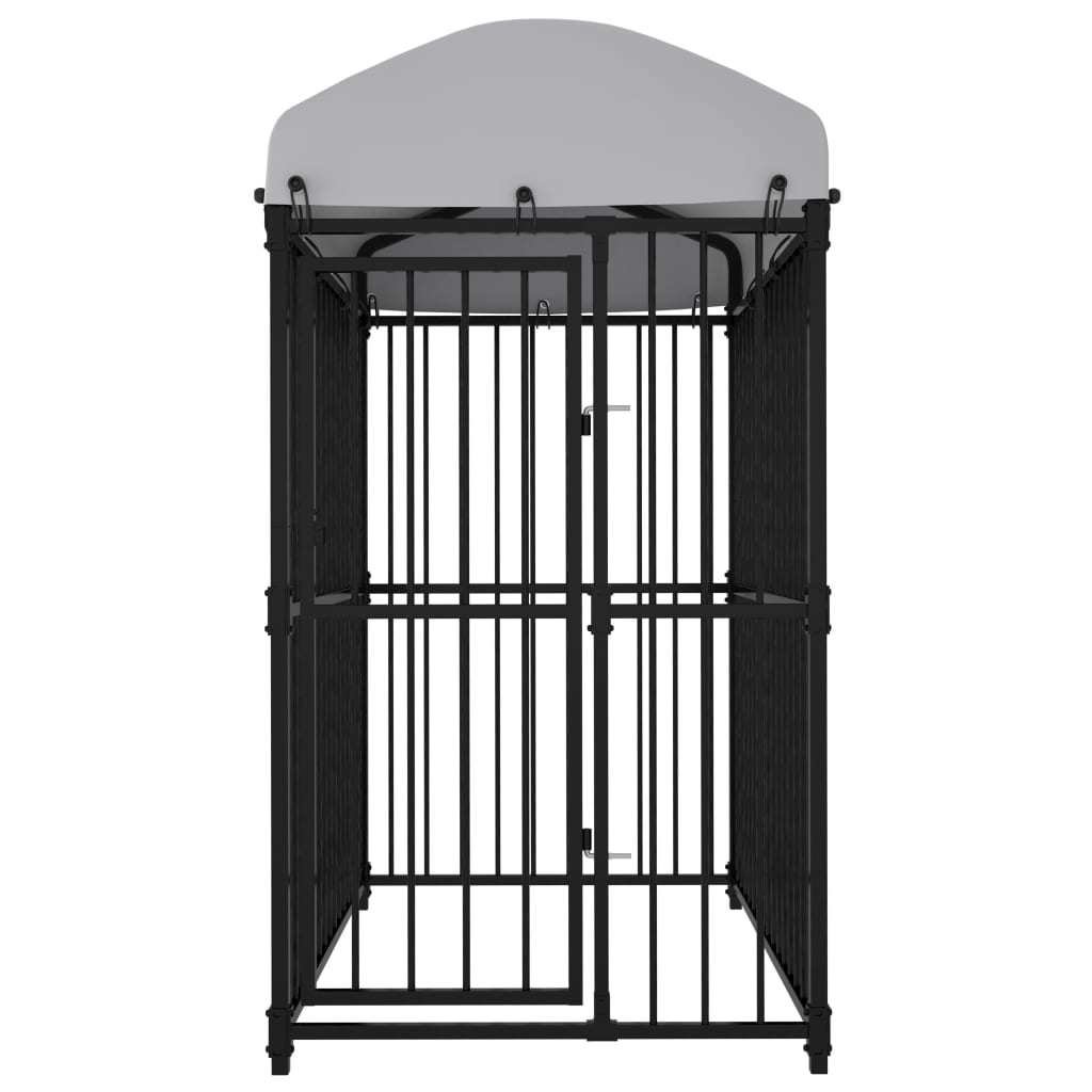This versatile, heavy-duty dog house features multiple uses: playing, exercising, training, or simply keeping your dog safe. It will be the perfect play paradise for your furry friends! This kennel provides ample exercise space while the steel bar walls help prevent mischief and unexpected accidents while enabling ventilation. Thanks to the sturdy steel construction in powder coating, this quality dog kennel is durable and built to last. The included top canopy is weather resistant, which will provide good protection against sun and rain. Additionally, the hinged door has a lockable latch system which ensures extra security and safety for your dogs. This kennel is easy to assemble.color: BlackMaterial: SteelDimensions: 59.1" x 39.4" x 68.9" (L x W x H) Gate size: 19.7" x 48.6" (W x H)Steel tube size: 1" x 1" (L x W)With a roofGate with lock for great safetySuitable for dogsFabric: Polyethylene: 100%