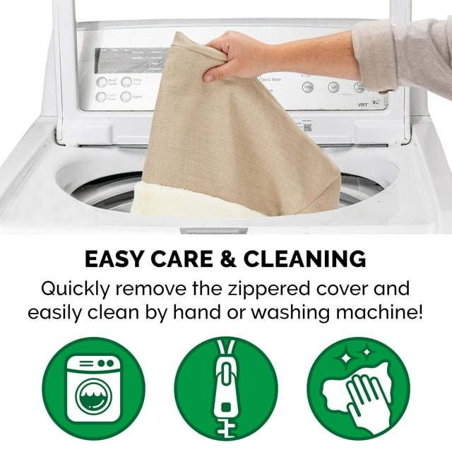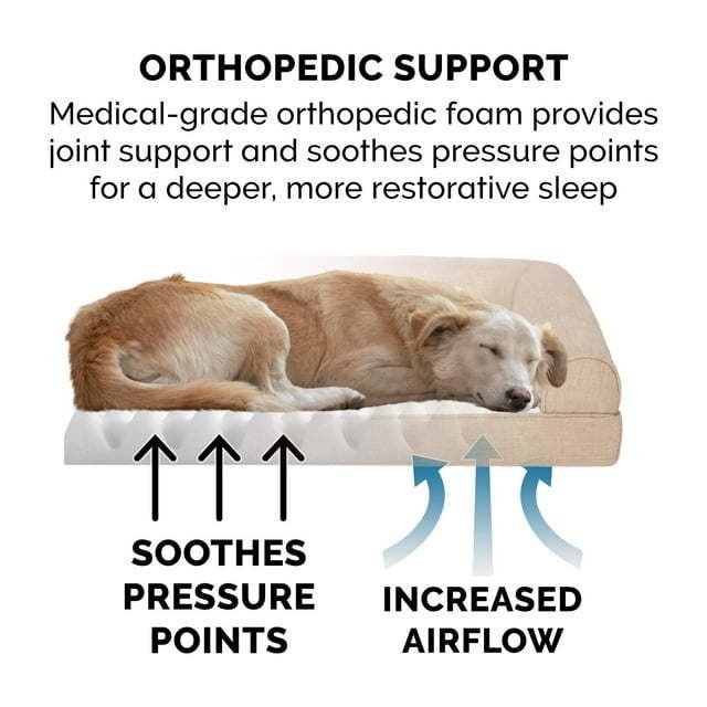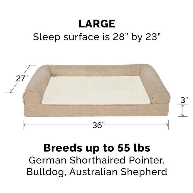 Product details COMFORT AS PRIORITY: The sofa-style design creates a cozy and inviting space that promotes comfort and security; designed with supportive bolsters for dogs to rest their heads on for optimum lounging comfort SLEEP SURFACE: Featuring a cuddly soft plush faux fur main sleep surface and bolsters wrapped in durable woven performance linen; both are gentle on noses and paws for enhanced snuggling and burrowing comfort EASY ON JOINTS: The egg crate orthopedic foam base helps cushion pressure points and improve air circulation, while fluff-filled bolsters support the neck, back, hips, and joints; helps ease discomfort and promote restful sleep CUSTOMER ASSURANCE: Comes with a 90-Day Limited Coverage against material defects and may also qualify for our 60-Day Worry-Free Program; restrictions apply: purchases from unauthorized 3rd party resellers may not be covered by Furhaven PRODUCT DETAILS: Orthopedic Dog Bed, Flax; Large - 36" x 27" x 6.5" (foam: 3" - sleep surface: approx. 28" x 23")Assembled Product Weight