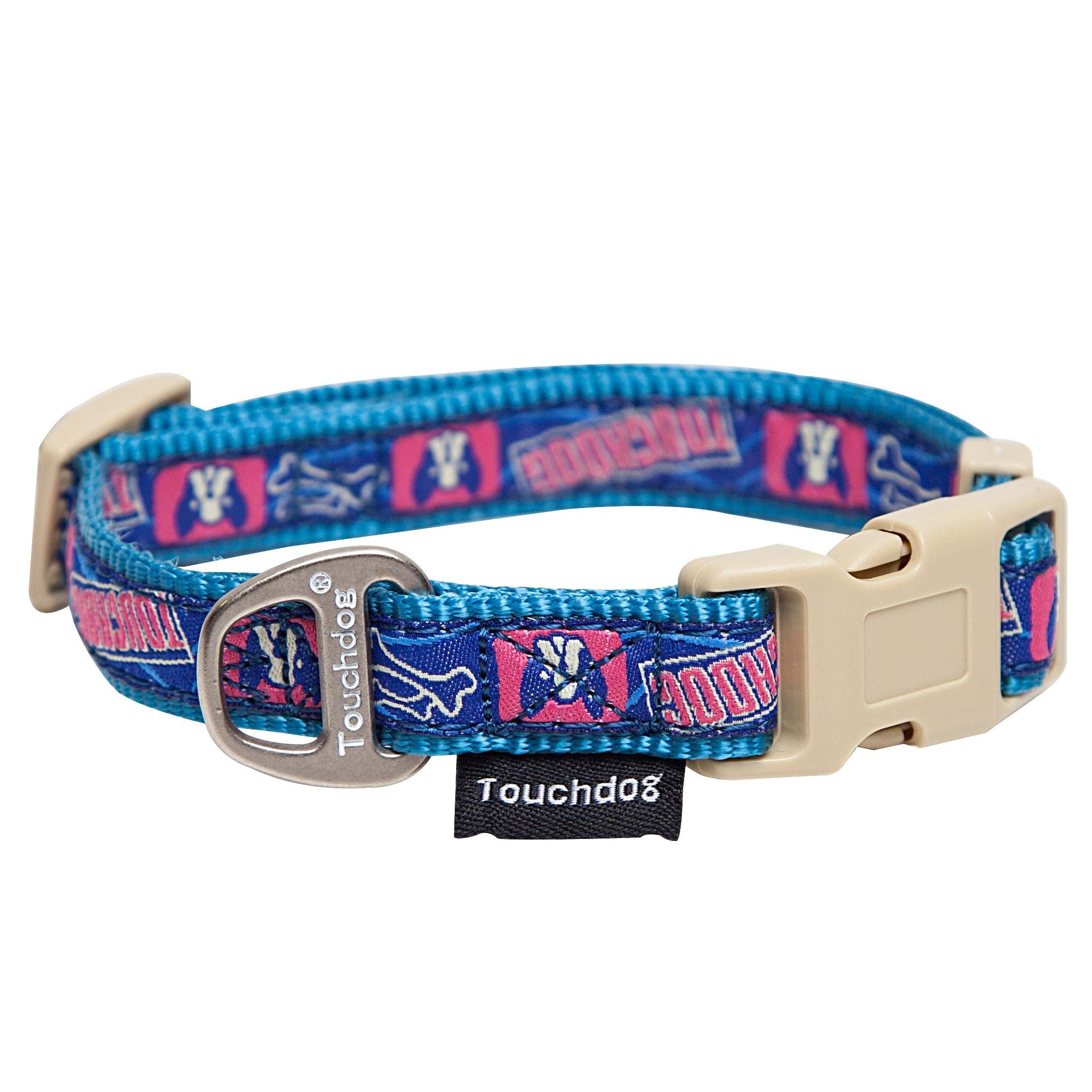 The Touchdog Tough-Stitched Durable Embroidered Collar and Leash features Dual-reinforced stitching for durability and a designer printed pattern with an accented Buckle and a Stainless Steel leash connector.